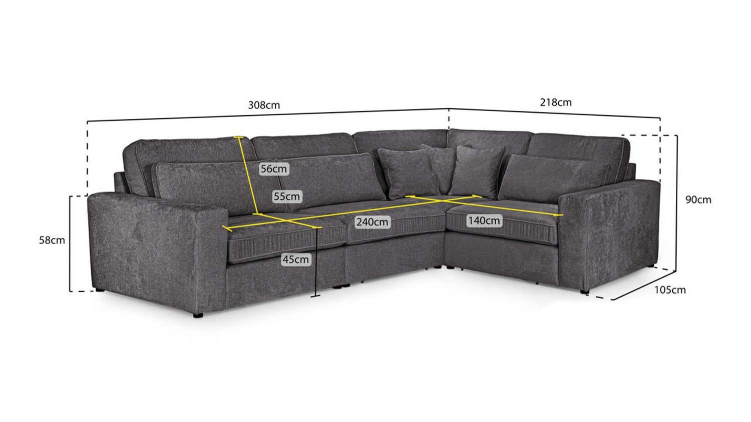 Length: 308 cm, Depth: 105 cm, Height: 90 cm, Floor to Seat Height: 45 cm, Back Rest Height: 56 cm, Length 2: 218 cm